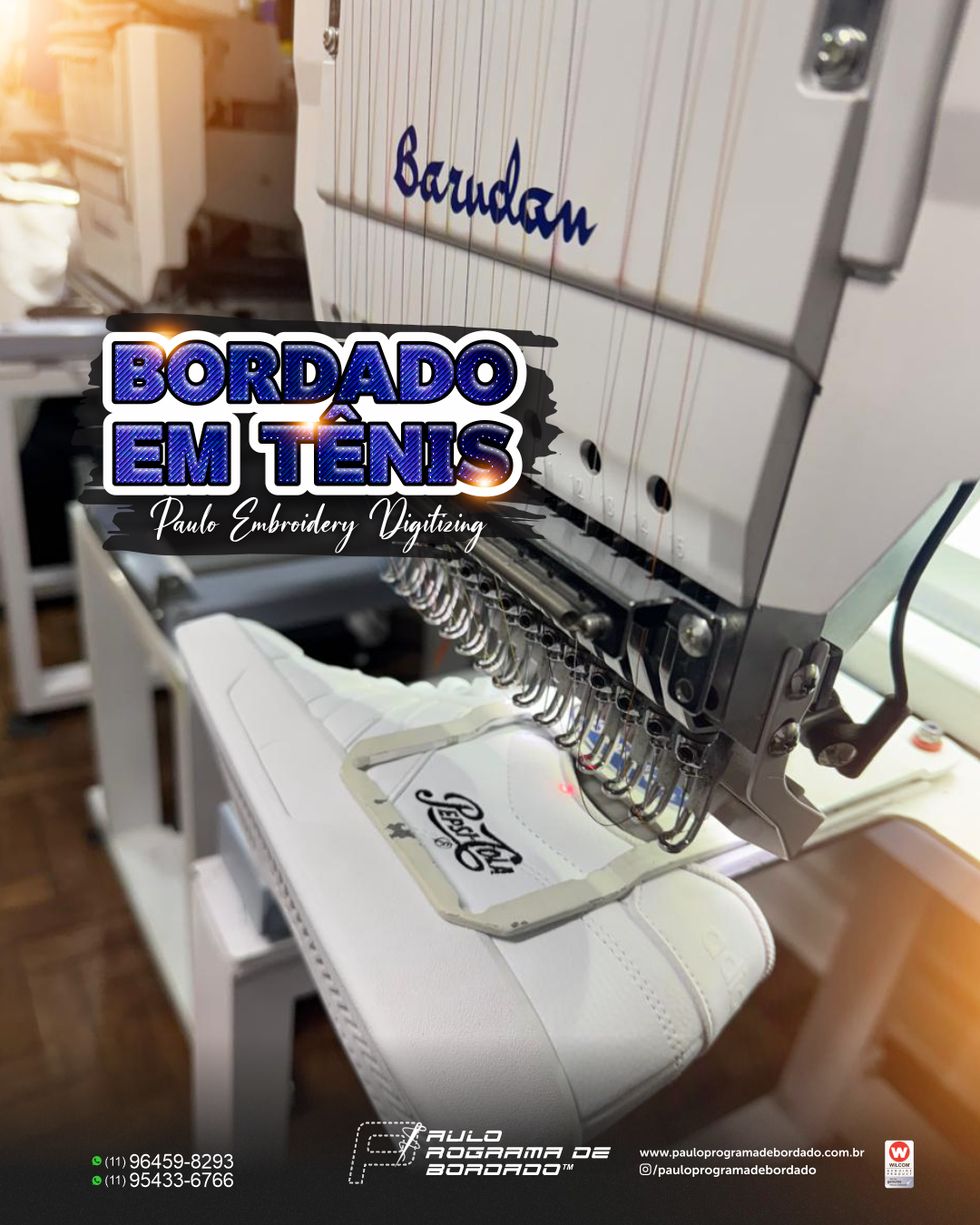 Dê um toque exclusivo aos seus passos com os bordados em tênis da Paulo Embroidery Digitizing! Aqui, cada detalhe é criado com máquinas Barudan de última geração e programado com o poderoso software Wilcom, garantindo alta definição, durabilidade e acabamento impecável.